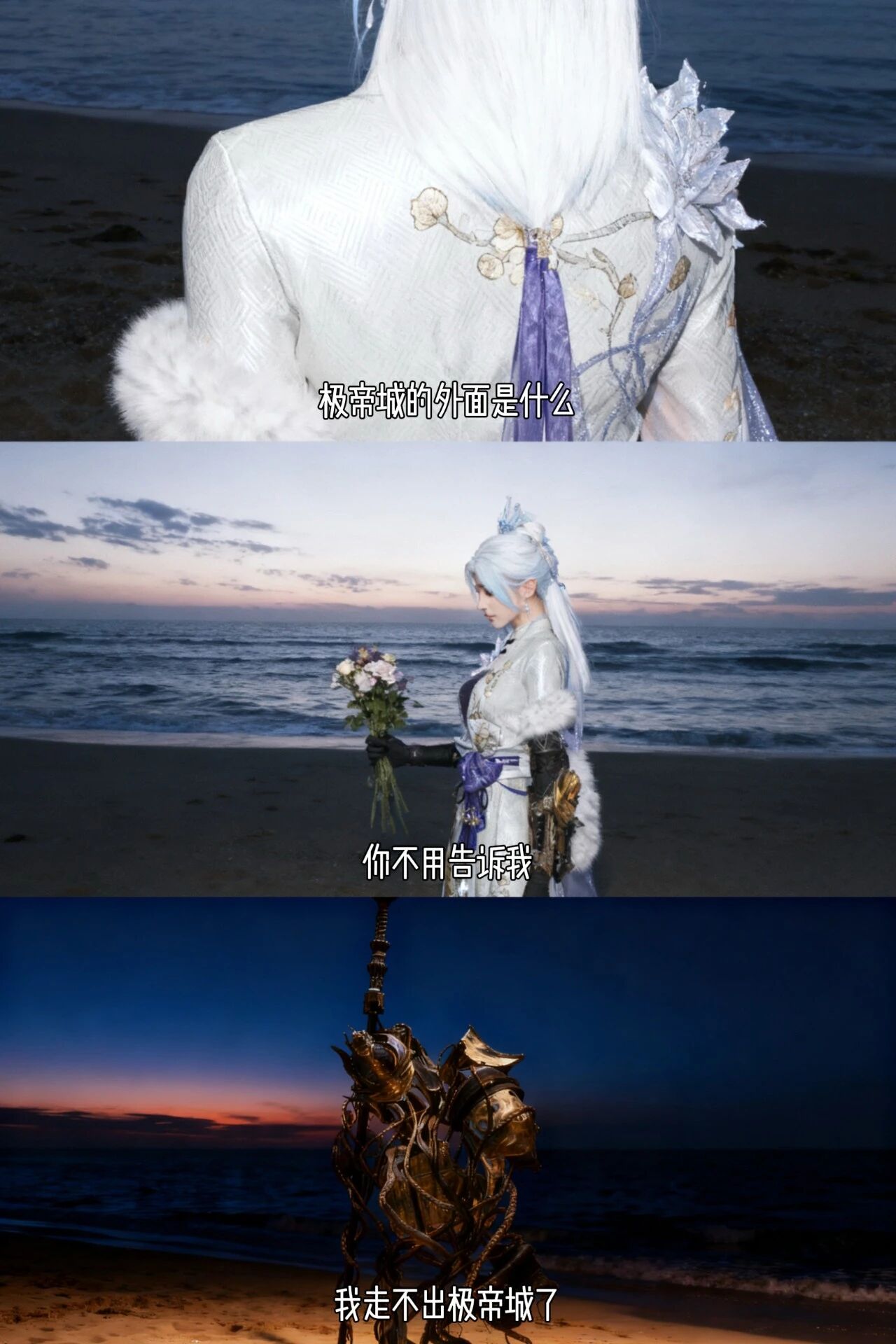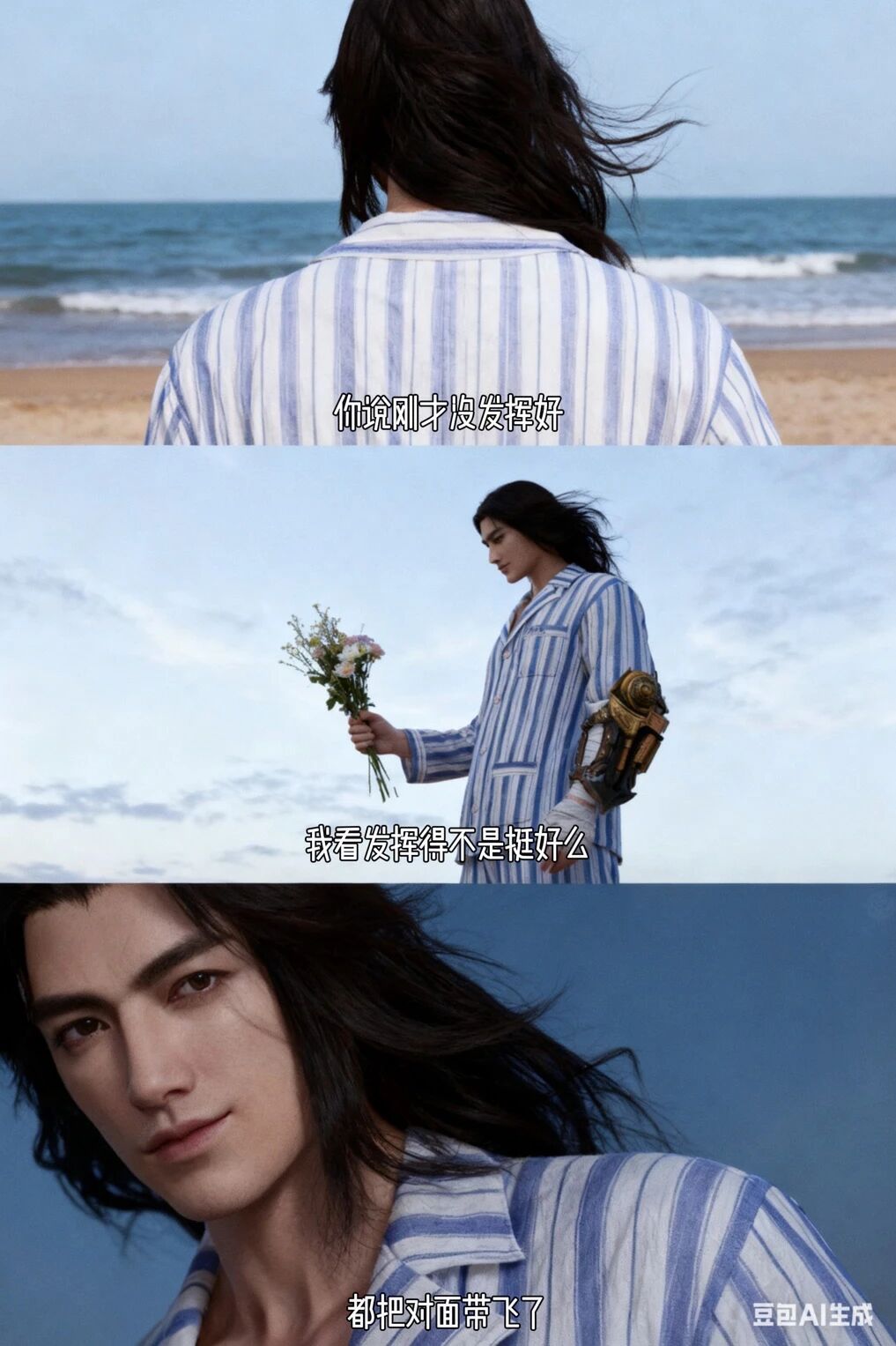 第二张为中景,人物手持一束花束,侧身站立于海边,看向手中的花,风吹起头发,发丝凌乱,添加字幕“________”;