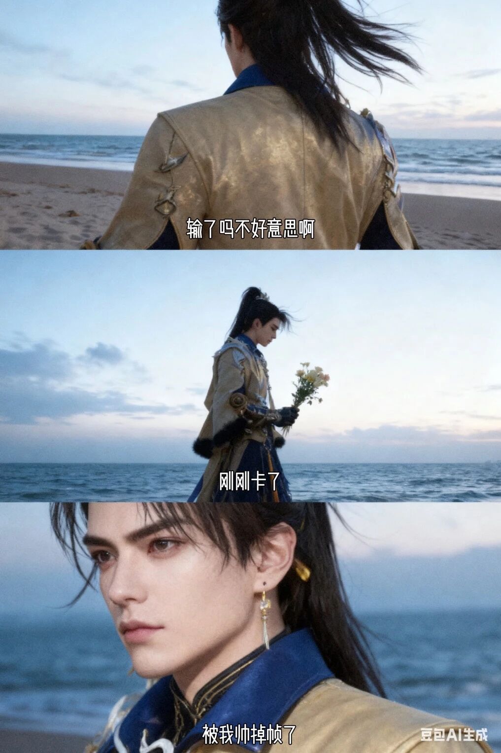“ 帮我生成一组三宫格胶片质感艺术感写真图,场景为海边沙滩、天空、傍晚。图中人物和参考图一致,人物和脸不变。