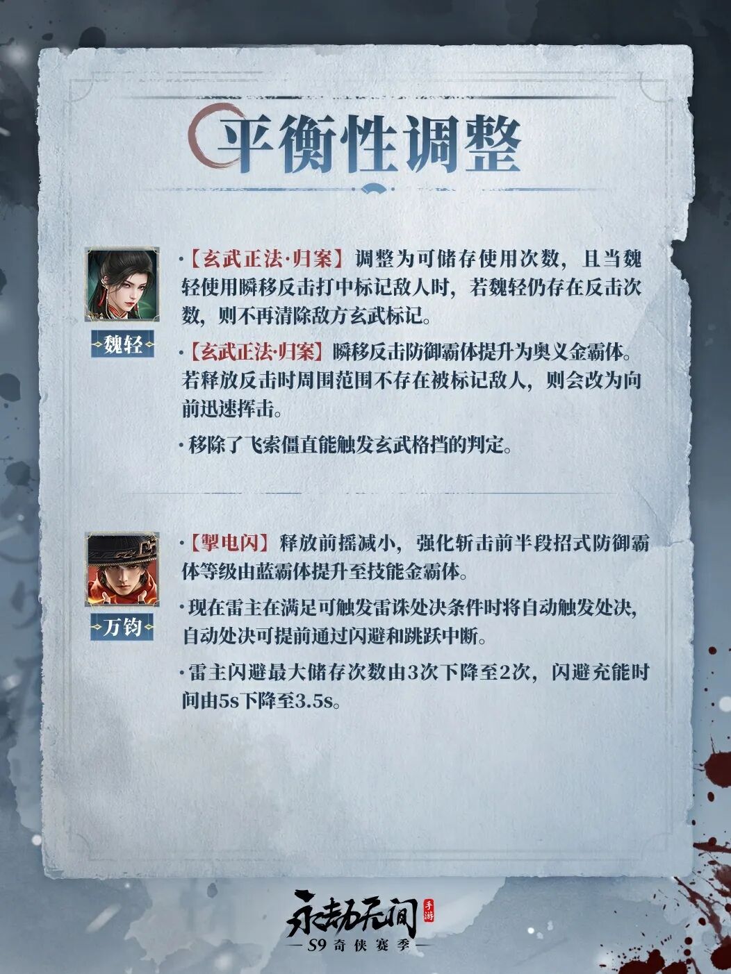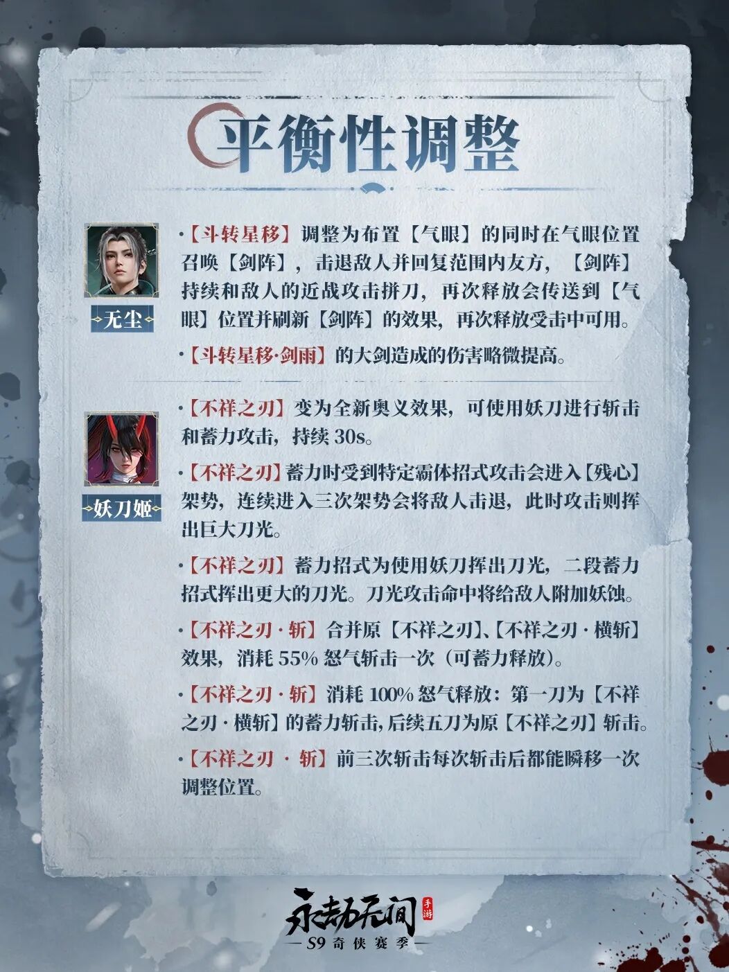 S9赛季英雄也迎来调整,根据后台数据与玩家反馈。我们将针对无尘、妖刀姬、魏轻、万钧、席拉、殷紫萍、崔三娘做出如下调整——