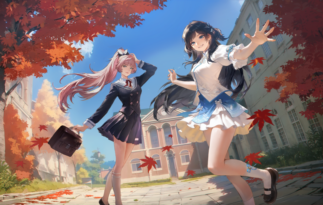 藏在衣角的枫叶,你发现了吗?JK时装上新,秋日序曲即将奏响!来和妖刀姬、蓝梦一起漫步校园~