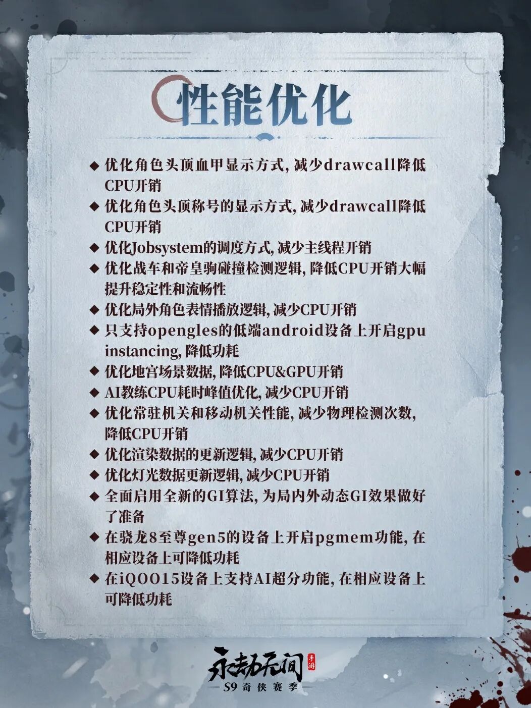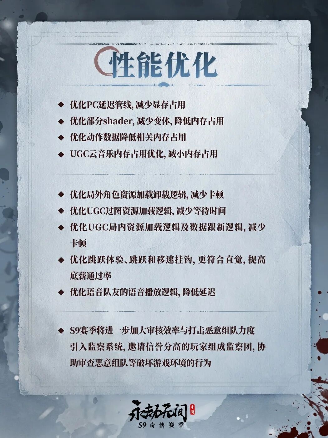 为了给大家带来更优质的游戏体验,我们持续对游戏性能、体验等方面进行优化!新赛季,有以下部分将迎来优化——