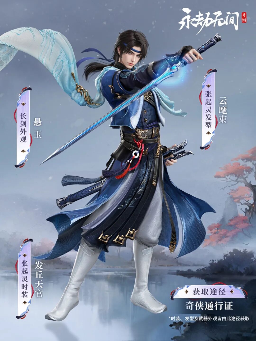 额前发丝微微遮目,尽显疏离与不羁。束发间锋芒隐现,满溢江湖侠气。