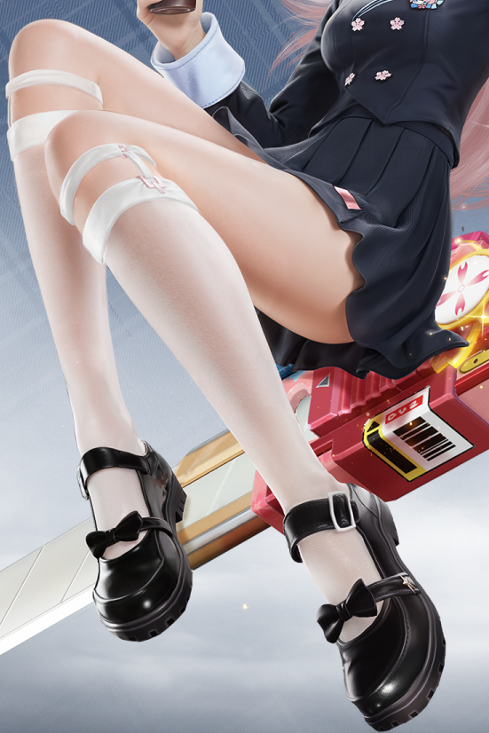 粉色刺绣贴短百褶裙,配以白袜与黑色皮鞋。袜口的樱花绑带,成为整套搭配的别致亮点。