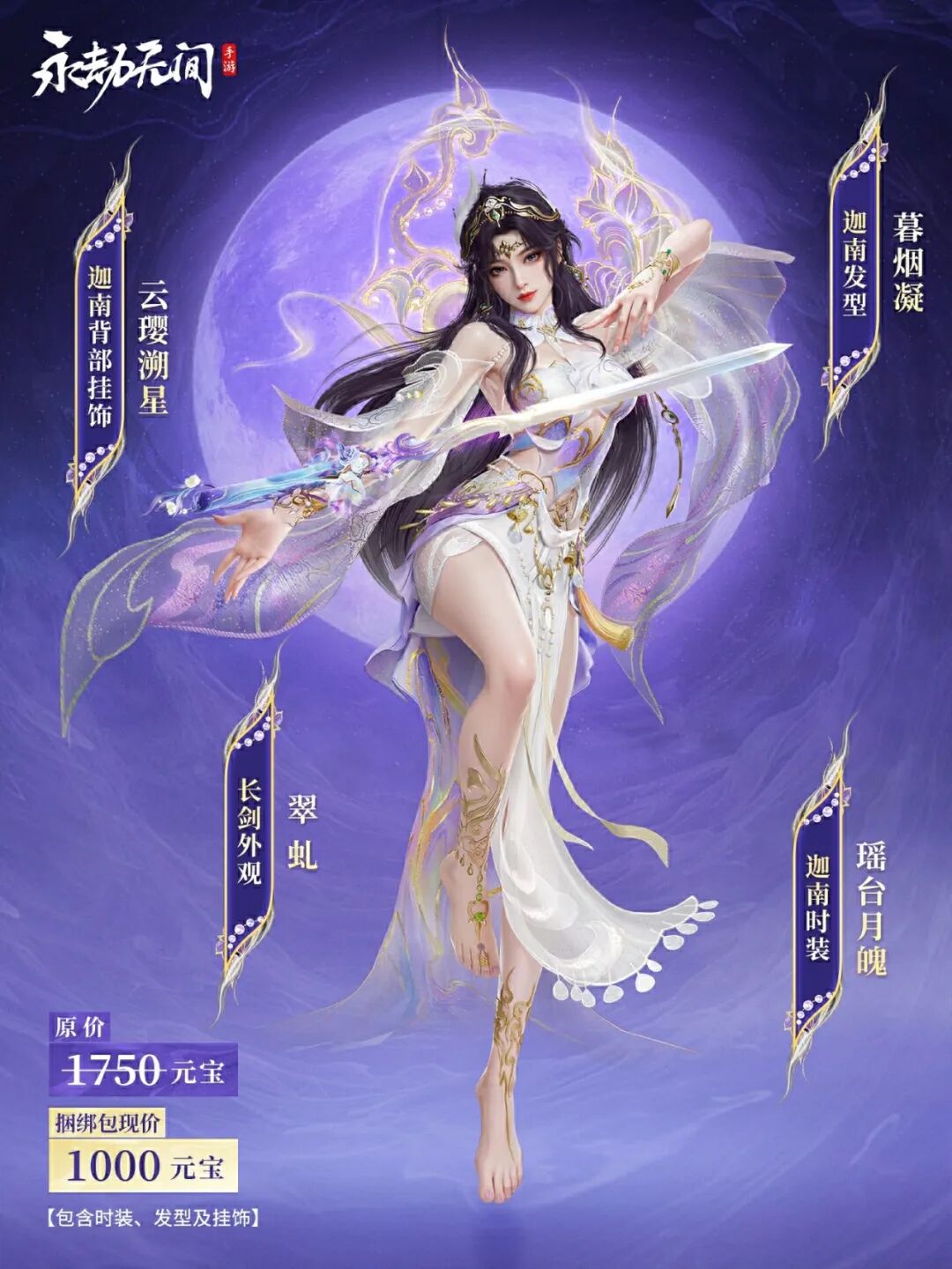 2、新增迦南捆绑包【瑶台月魄捆绑包】。捆绑包内含迦南极品时装【瑶台月魄】、迦南极品发型【暮烟凝】、迦南极品挂饰【云璎溯星】。捆绑包原价1750元宝,折扣价1000元宝。单独购买对应单品即可享受折扣,购买捆绑包将享受更多折扣。