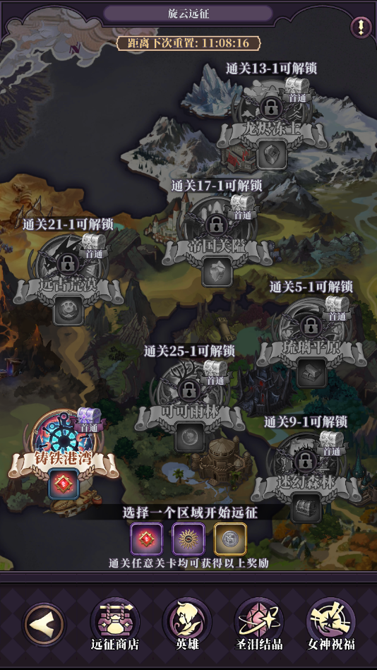1、旋云远征是最早开启的副本,在推图2-04就可以开启,一共有7个地图,每个地图根据推图关卡通关情况再进行开启,第一个地图是钢铁港湾,其次是琉璃平原,迷幻森林,龙烬冻土,帝国关隘,远古荒漠和可可雨林。每天一刷新,但是每天只能选择一个地图。 如下是每个分地图解锁的推图关卡预览。