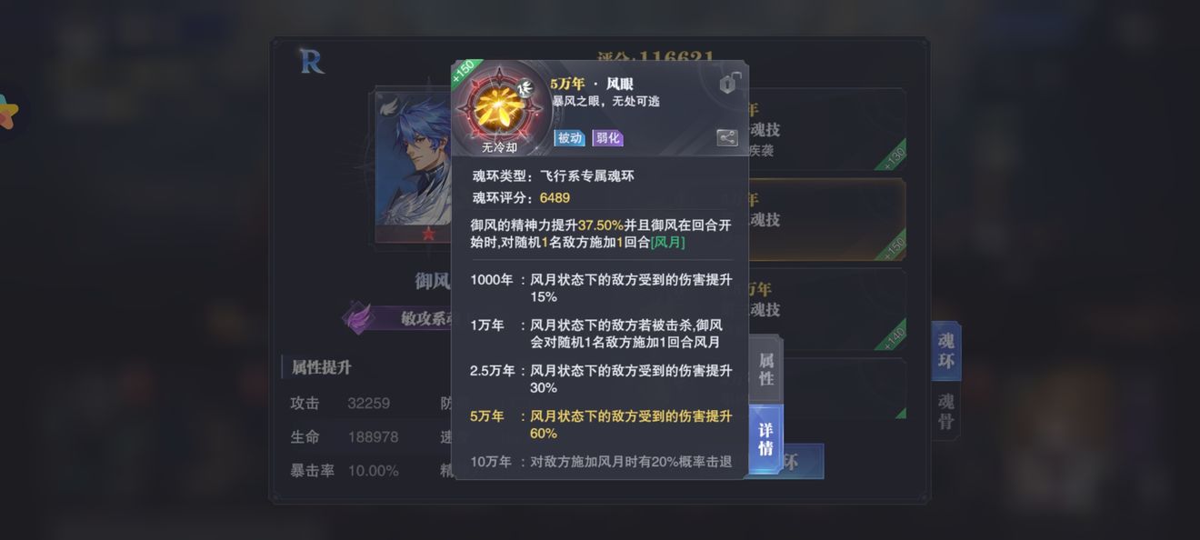 第一魂环我们带邪虫系,推条加攻击力。很实用的一个技能。第二魂技我们带飞行系,增伤效果60。第五魂环我们选择带暴击伤害,因为风笑天的技能可以做到无限暴击,且肯定能吃到这个暴击伤害,其他7个人并没有任何改动。不过我们要注意操作顺序。