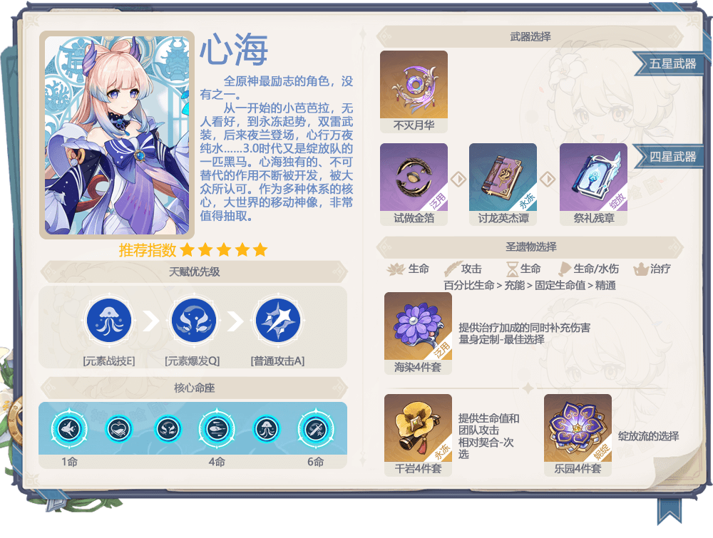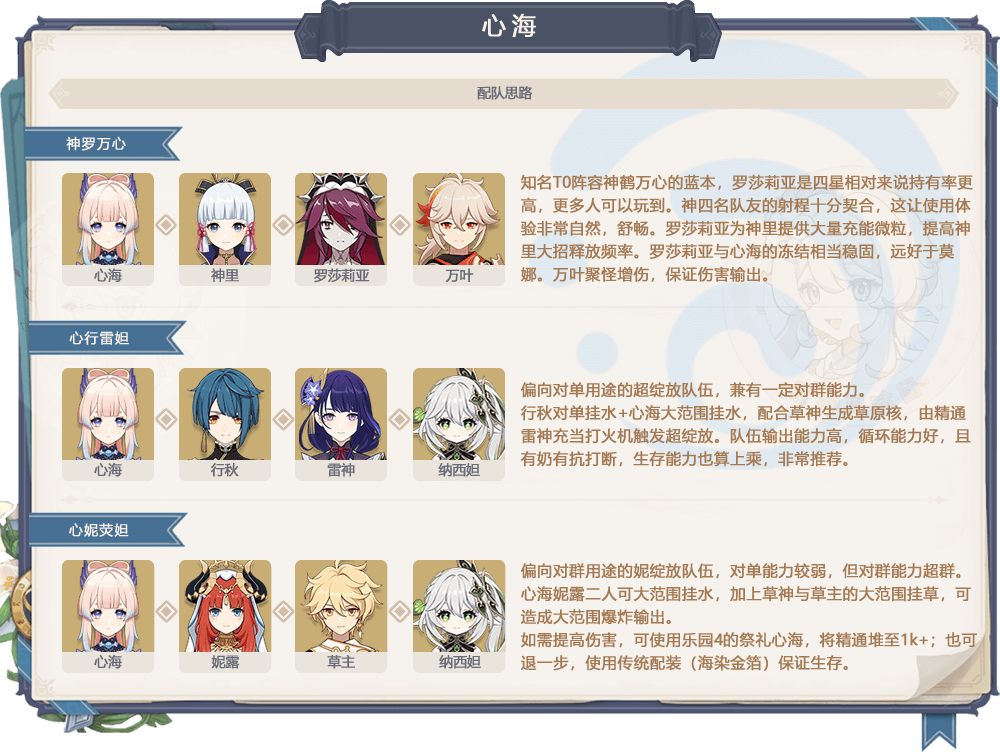 心海的强度随着版本更替不断提升,心海的培养价值也跟着水涨船高。如果打算培养下图中的队伍,那么很推荐抽一只0命心海去辅助。