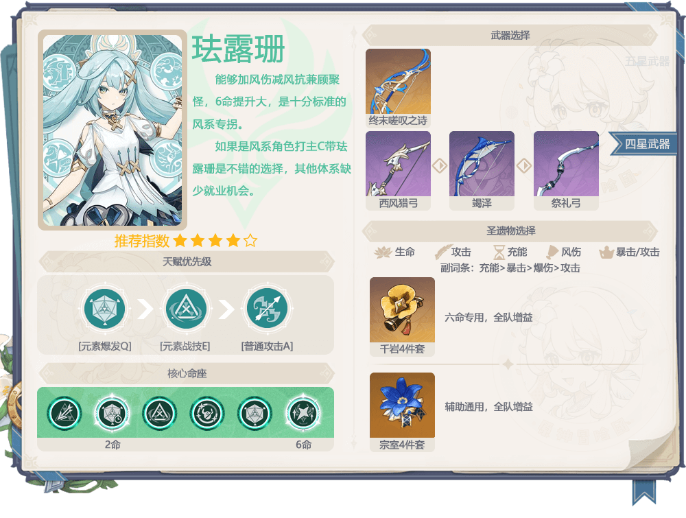 2命加Q持续时间,4命加充能,6命加充能和伤害。主玩风C的话,很推荐抽满,不过也要量力而行。