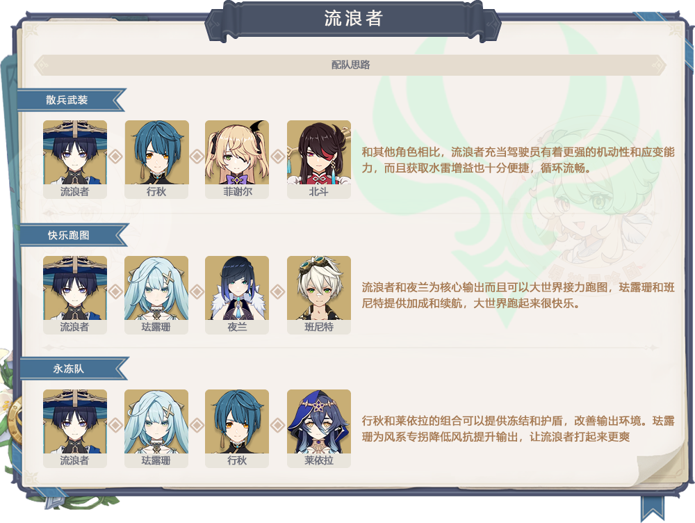 流浪者最大的优势还是在大世界探索,高速空中水平位移+悬浮爬升位移可以大幅提高开放世界的探索体验。推荐注重大世界体验的玩家抽取。想要打出高伤害比较吃操作和珐露珊,养成要求较高。