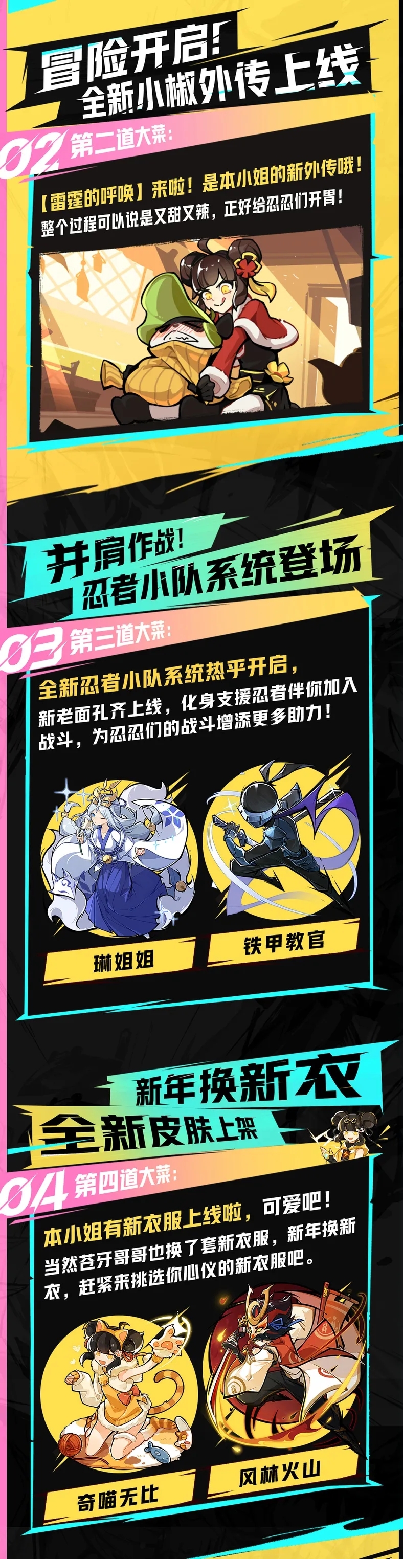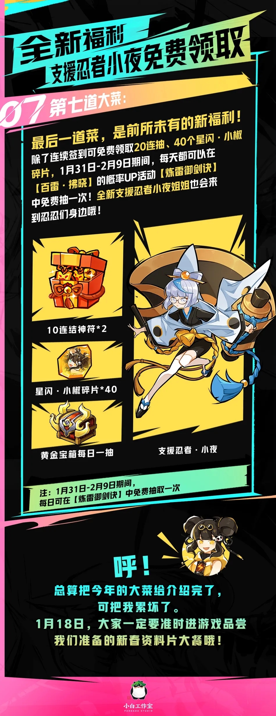 1月18日新版本开启后,十连结神符*2,星闪·小椒碎片签到领取福利已备齐!新武器上线后,也将有每日免费抽取福利等待着忍忍们!