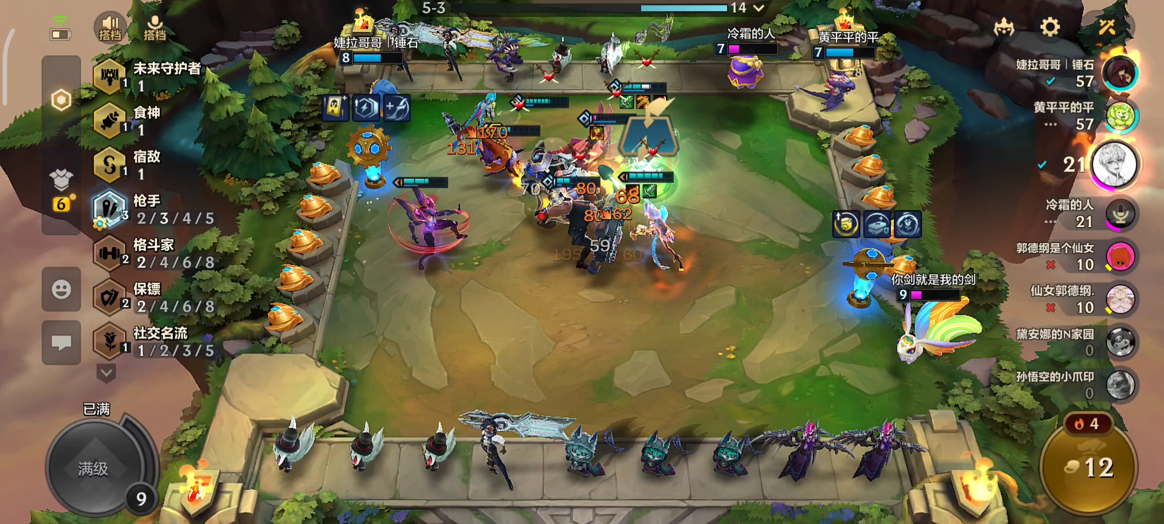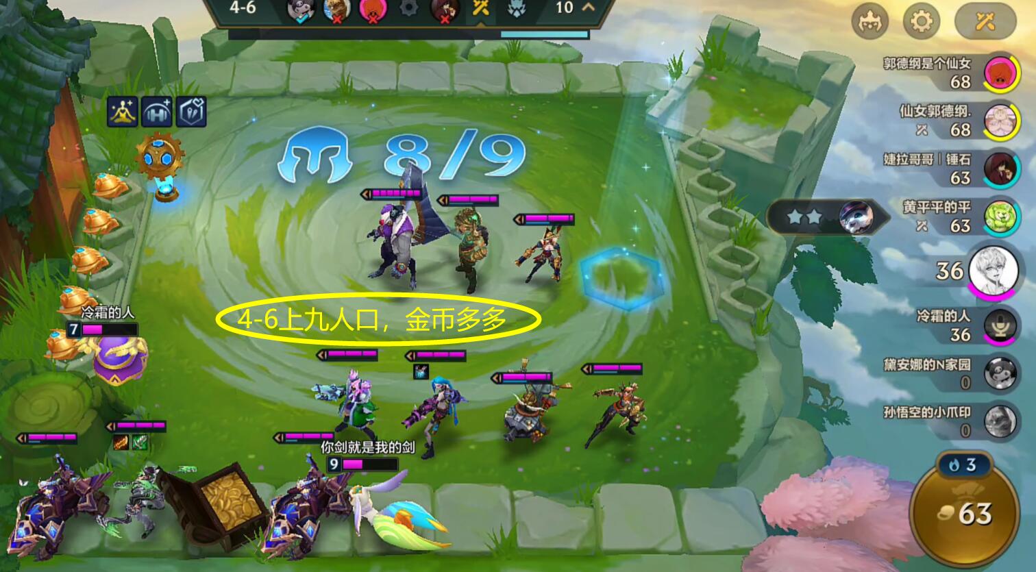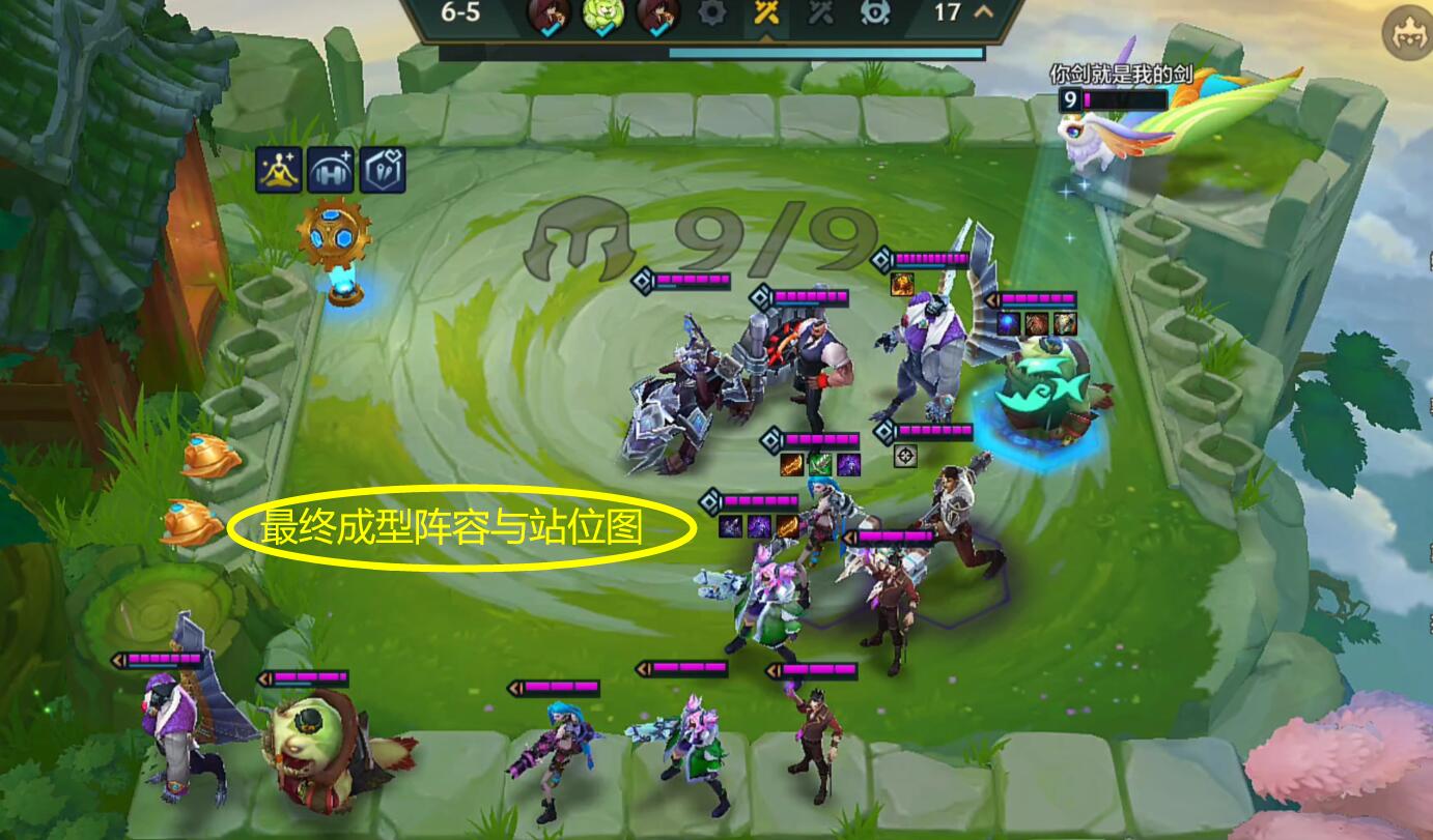 等到了九人口之后,需要根据自己的装备来选择阵容,有鬼索狂暴之刃、汲取剑、巨人捕手这些,自然选金克丝,如果是朔极之矛、珠光护手,就选维克托。五费英雄中,金克丝泽丽以及远程杰斯的装备都可以通用,防御装备则适合加里奥、塔姆、近战杰斯。如果上加里奥,建议再搭配一个四费的布隆,凑出保镖羁绊。