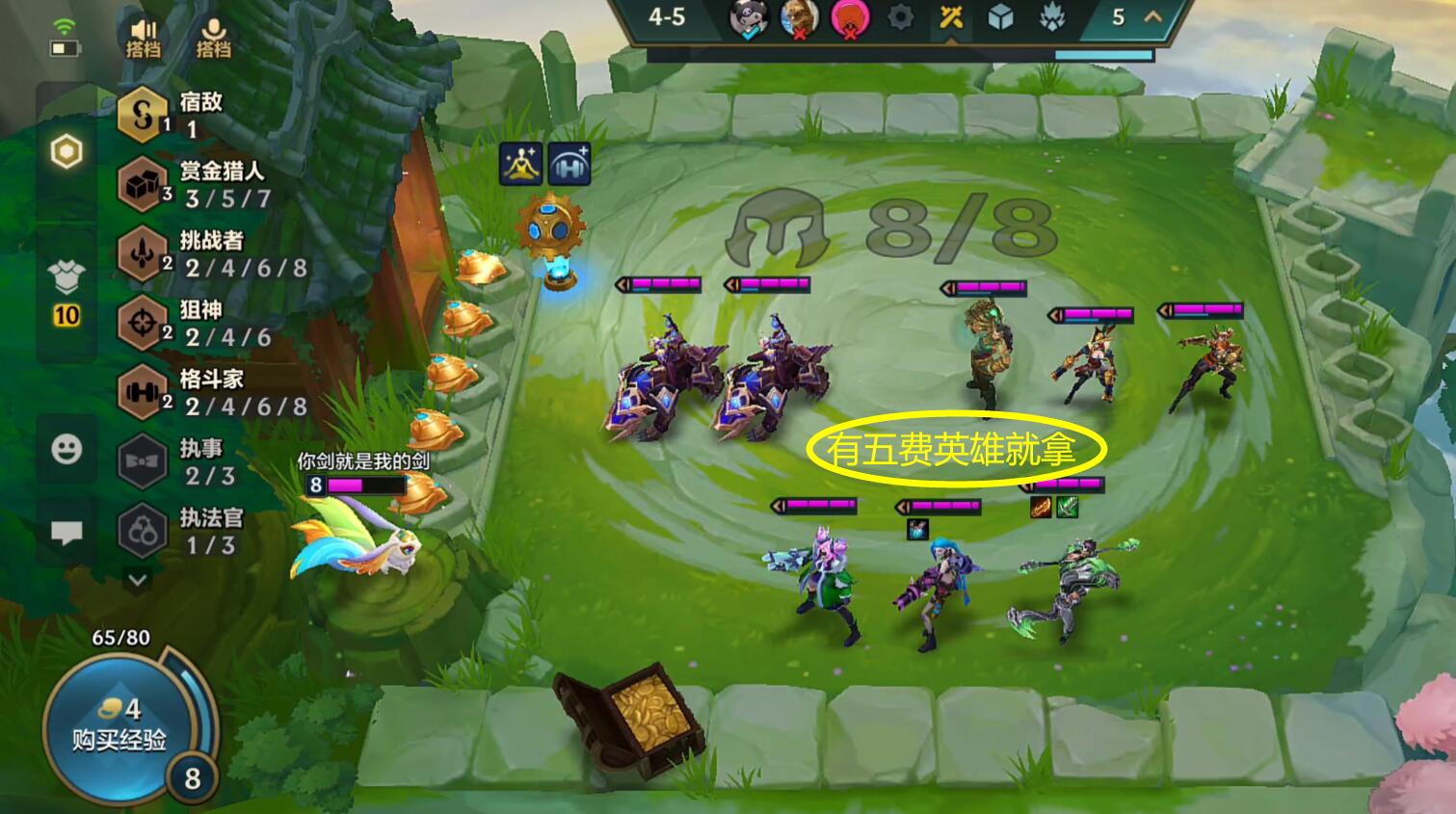 等刷到三赏金之后,观察一下其他玩家的阵容,如果有同样玩赏金的,那么就只上三个赏金猎人,以免被断连败。如果其他玩家没有用3赏金、3约德尔人摆烂的,多上几个也无妨。不过,有一点需要注意,质量不能太高,否则一旦拖的时间长了,队友就会过来支援,同样会导致赏金连败被终结。要知道,三赏金如果不能连败七八个回合以上,收益并不高。