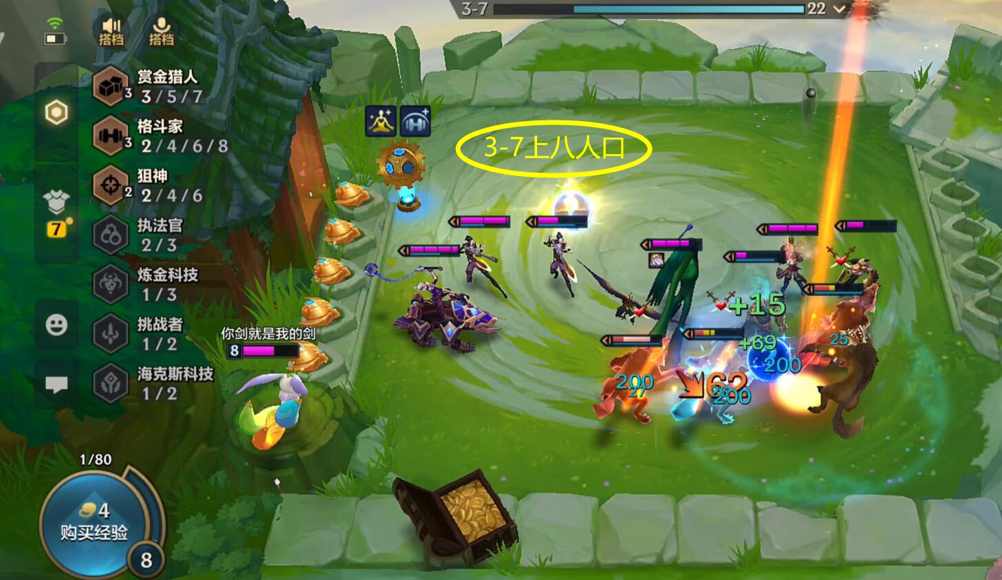 前期,在没有3赏金之前,不用刻意卖血,随便搭配一些格斗家、保镖的羁绊都可以,如果在第二轮选秀中看到三费赏金牌,能拿就拿。由于备战区不能留牌,如果想要将一个英雄升到两星,可以直接上两个一样的英雄,反正每个回合多三点经验,在前期有人口等级的优势。