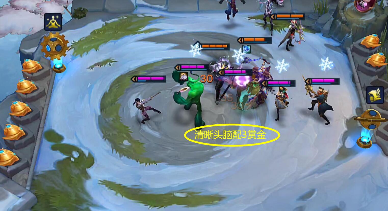 “清晰头脑”可以让玩家每个回合多三点经验(选秀除外),前提是备战区没牌。双人模式中,一队胜利,一队战败的情况下,扣血非常少,拿到清晰头脑后,刷连败无压力,还可以搭配赏金猎人,积累之下,获得的收益就非常可观了。首先,清晰头脑每个回合3点经验(相当于3金币),连败五回合之后,每个回合额外3金币,再加上赏金连败开宝箱的收益,可以让你快速冲到九人口。