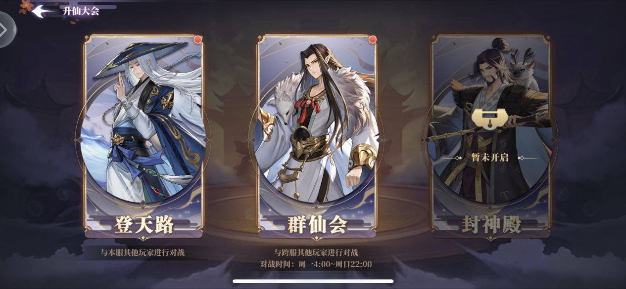 升仙大会总共有三个玩法,分别是登天路、群仙会和封神殿。目前登天路和群仙会已经开启。这两个玩法都可以与真实玩家进行对战。