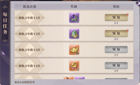 接下来我们聊一聊群仙会,由于群仙会是与跨服玩家进行对战,所以相对是会有一些难度的!每日挑战群仙会,无论成功与否,都是可以拿到挑战奖励的!所以说,咱们该薅的羊毛还是要薅的!