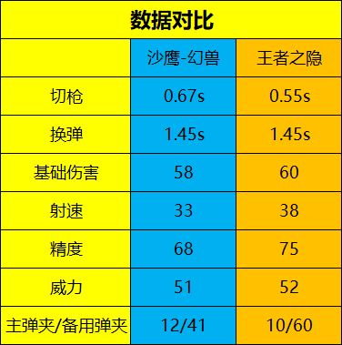 作为沙鹰-幻兽的升级版,该武器在射速、伤害、切枪、精度等各方面的整体性能都有了十分明显的提升,唯一美中不足的就是王隐的后备弹夹数少于原版沙鹰-幻兽,以下即为小编对比整理后,王者之隐相较于沙鹰-幻兽的整体性能对比。