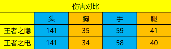 大家可以看到,除去后备弹夹数较低的不足外,在其他的各个属性方面十分显著的提高,进而相比于王者之电,首先小编对两把武器的贴脸满AC所造成的伤害进行对比,以下即为小编的对比数据。