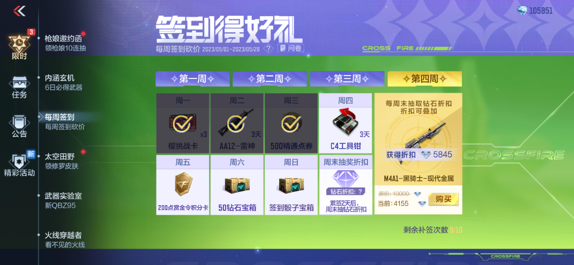 哈喽各位CFer们大家好~时光如流水,不知不觉就到了5月的最后一个周末。为了让大家在这个周末玩得愉快,游戏中即将上线久违的百抽礼包活动,同时商城和钻石礼包也会进行更新,快随本期活动先知一起来看看吧!