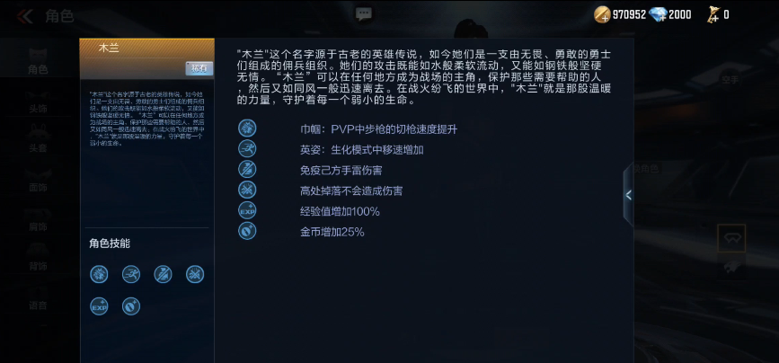 此次活动的大奖当然是永久角色木兰,木兰角色是橙色品质的道具,其属性有巾帼:PVP中步枪的切枪速度提升;英姿:生化模式中移速增加;免疫己方手雷和高处掉落不会造成伤害等属性。