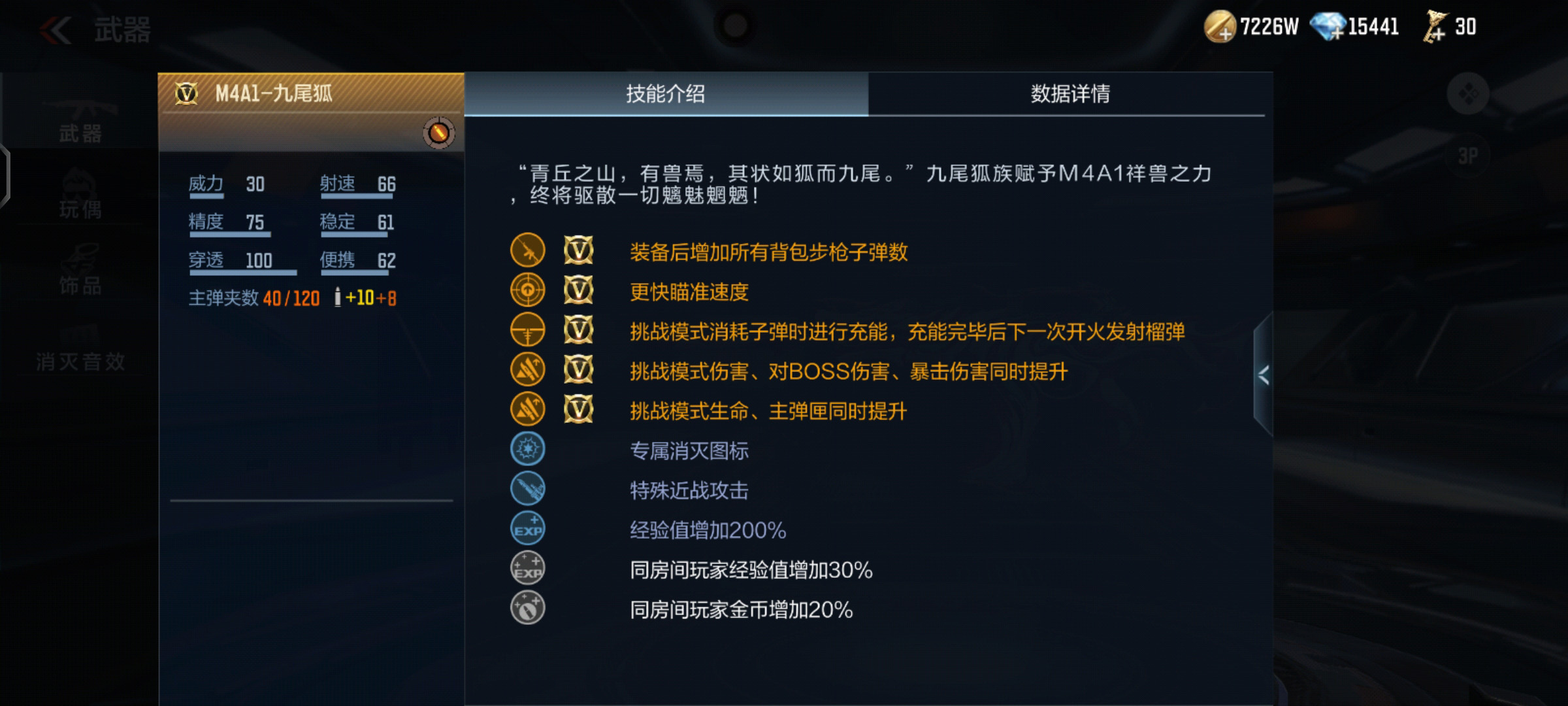 接下来我们来看一下M4A1-九尾狐这款枪械的属性技能吧。常规属性增加背包步枪子弹数、金币经验加成等等这些不再赘述。首先是第一个特殊属性:更快的瞄准速度。同样拥有这项技能的枪械还有M4A1-星象、M4A1-七色宝葫等等,这项技能可以使我们在竞技模式中更快瞄准敌人,占据先机。