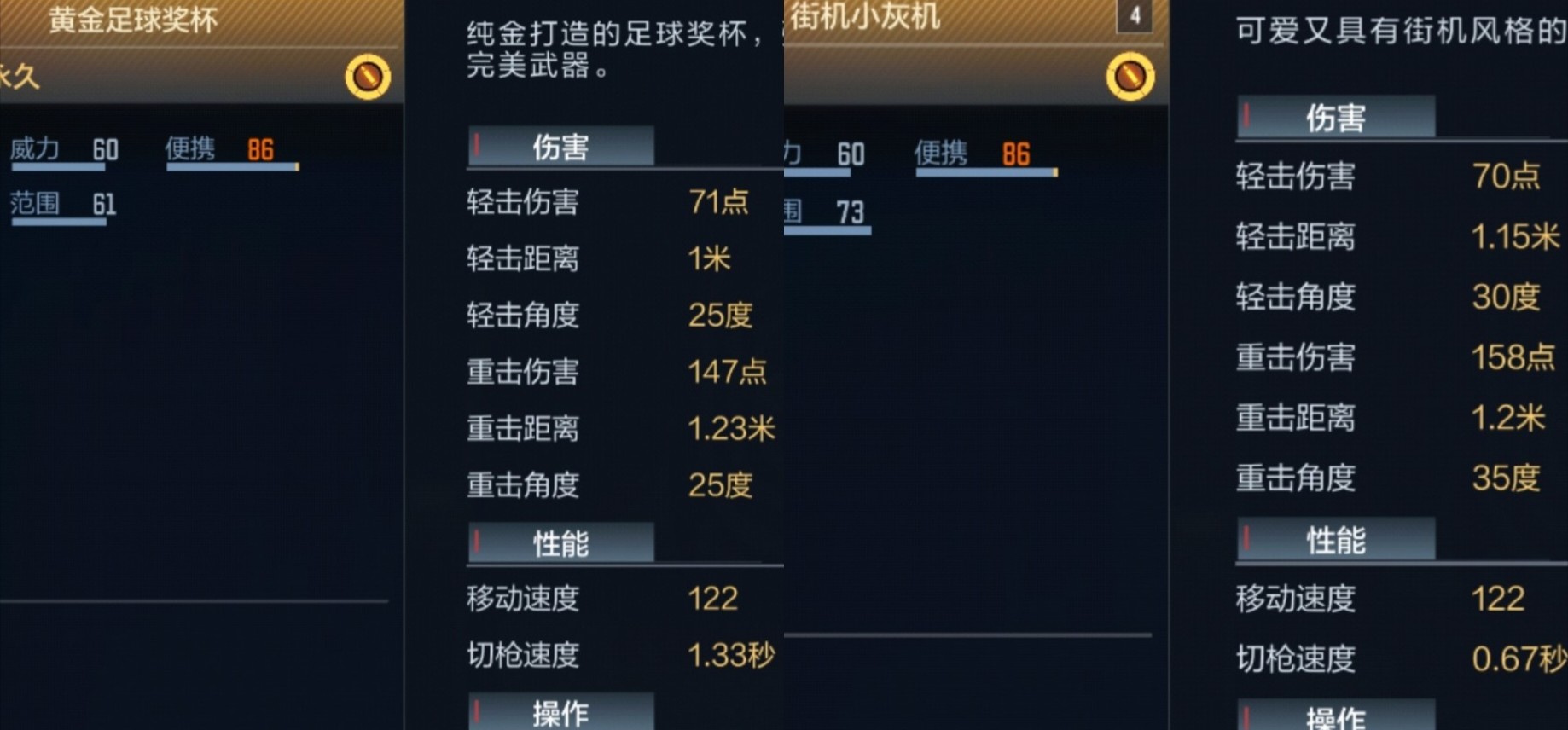 我们可以很清楚的发现,虽然街机小飞机在轻击伤害方面少了1点,但是在轻击距离上做到了补强。实测中轻击一下的伤害是70点,两发轻击足够将敌方cfer送回老家,所以说伤害方面这1点可以直接忽略不计。而且街机小灰机的重击伤害与重击角度相较于“黄金足球”会更加的优秀,性能方面个人认为是远超其对比武器,遥遥领先!