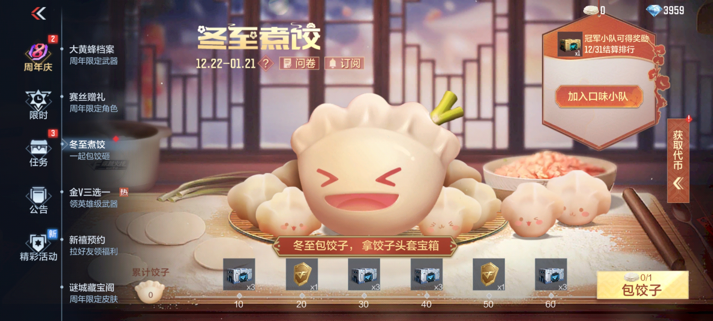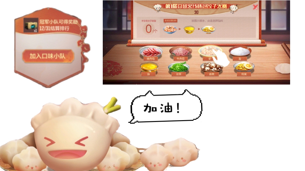 此外,在冬至煮饺活动中,你还可以选择你喜欢口味小队,通过完成小游戏获取饺子为其加油助威。截止到12月31日,四个口味小队中的饺子总数冠军队伍还可以额外领取50钻石宝箱*1。