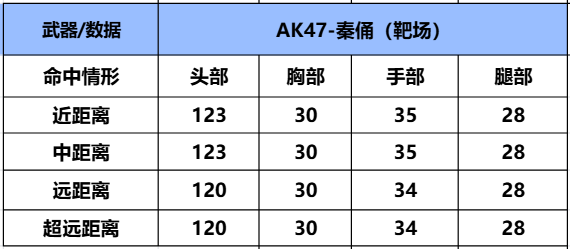 从伤害测试上可以看到,AK47-秦俑的伤害测试,打中头部的伤害会因距离而衰减一些,打中胸部和腿部的伤害不会因距离而衰减,打中手部的伤害因距离只衰减1,看来这把武器的威力还是很可观的。
