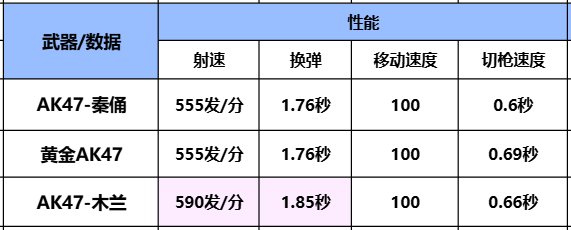 从武器性能上对比可以看到,在移动速度和切枪速度上,AK47-秦俑与其他两款武器的性能数据一致,在射速上低于AK47-木兰。但在换弹上要高于AK47-木兰,可见AK47-秦俑还是有一些优势的。