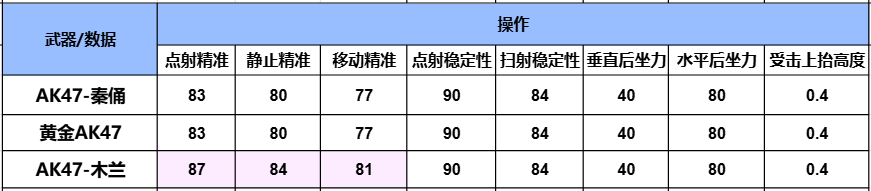 从武器操作对比上可以看到。AK47-秦俑在点射稳定性、扫射稳定性、垂直后坐力、水平后坐力和受击上抬高度上,都和其他两款枪械数据一致,在点射精准、静止精准和移动精准上,略微低于AK47-木兰。