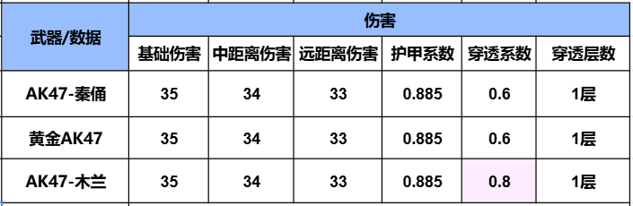 这里用AK47-木兰和黄金AK47对比,我们可以看到AK47-秦俑在伤害数据上,和黄金AK47伤害数据一致,只是在穿透系数上略低于AK47-木兰。这么看来AK47-秦俑武器伤害数据并不差。