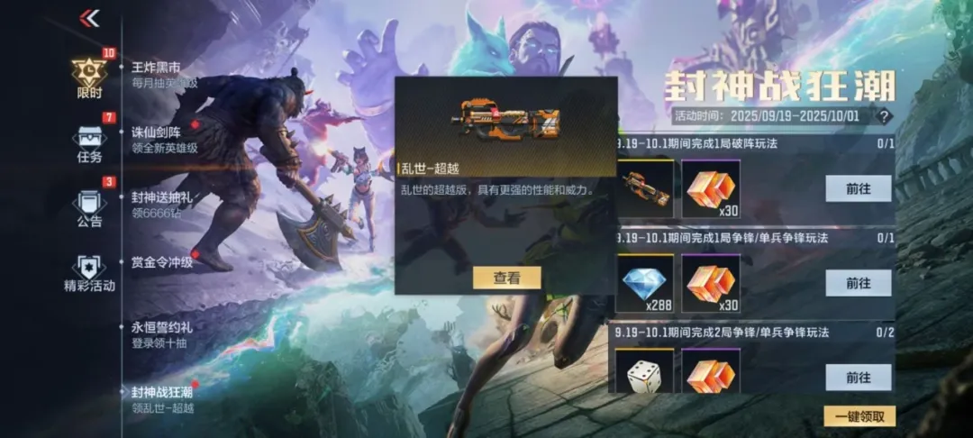 封神狂潮挑战模式现在已经上线了,游玩封神狂潮-破阵模式1局即可领取乱世-超越。除此之外,按要求完成挑战任务还可以获取大量的封神宝玉,这可是提升灵器系统的必备道具~