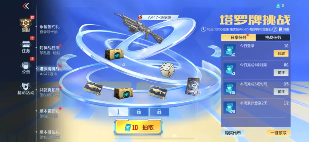 版本更新后登录即可领取500钻、王者之骰x2,攒起来总会有用武之地的。另外,在版本更新礼活动中还可以领取到FN-F2000-十绝阵觉醒(3天)和双持CZS2-魔礼寿(3天),一起来体验新武器!使用双持CZS2-魔礼寿击杀5人还能再领取1个王者之骰~