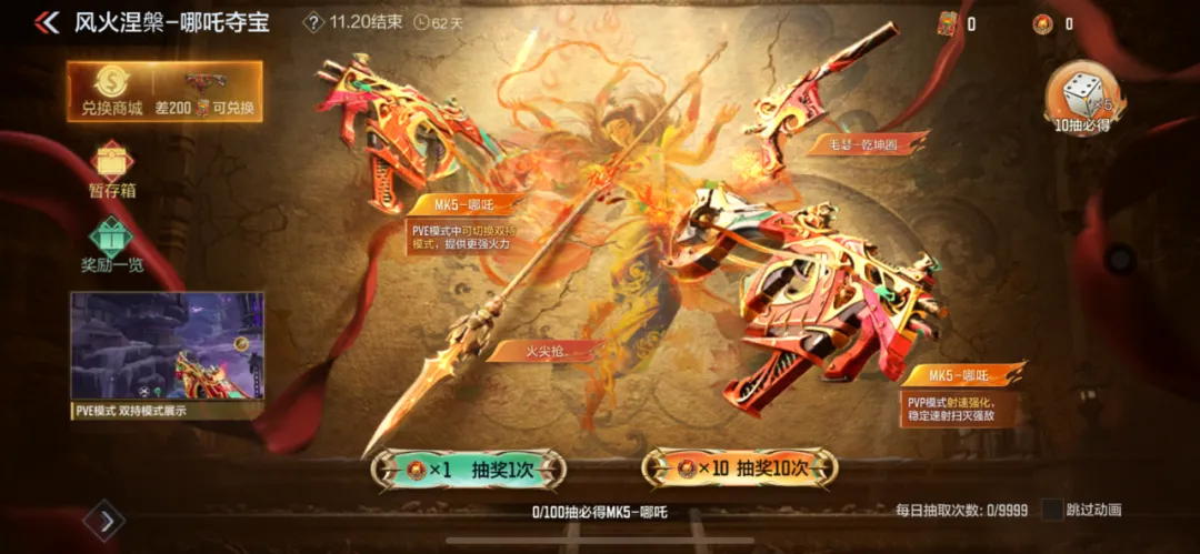 风火涅槃-哪吒夺宝可以说是诛天十阵诀版本的主题夺宝活动,以“哪吒”为灵感设计的全新挑战武器,哪吒主题套装武器包括:MK5-哪吒、毛瑟-乾坤圈、火尖枪。不光是外观设计融入了哪吒元素,技能特效与效果也与哪吒有关。值得注意的是,巴雷特-坦克堡垒会在该夺宝的兑换商城返场。
