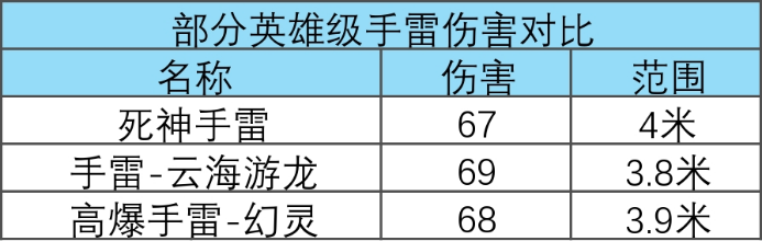 论核心输出,高爆手雷-幻灵的表现稳扎稳打。实测满雷伤害68点,介于死神手雷的67点和手雷-云海游龙的69点之间;爆炸范围虽稍逊——没死神手雷的4米广,但也不像云海游龙的3.8米紧凑,放到免费手雷里绝对是第一梯队。对预算有限的平民玩家而言,这颗雷的伤害与范围平衡度,堪称“毕业级”选择。