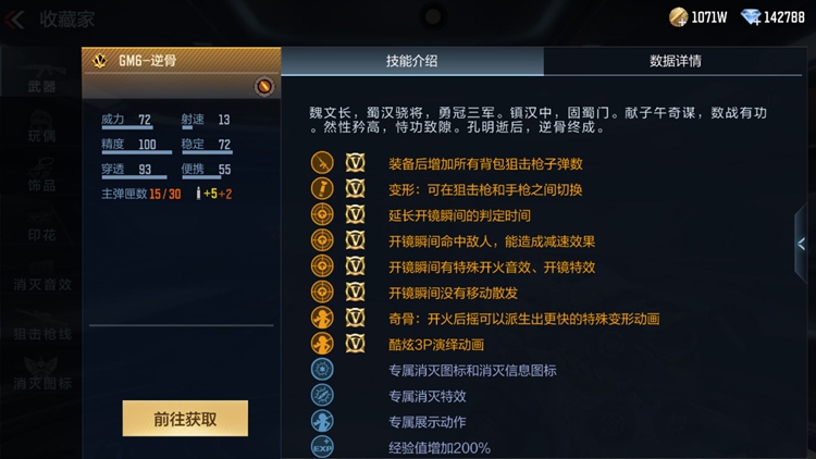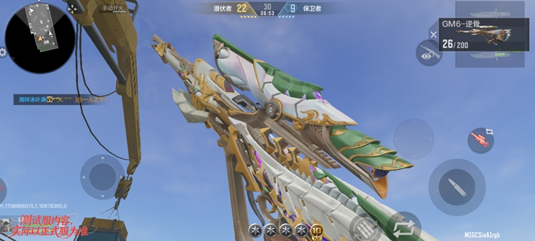 GM6-逆骨通体白金色,高贵气息展露无疑,而枪身上下又用青色和紫色光效一点缀,又带点邪魅的感觉。最有意思的当属它的检视动作,你正常看枪,它枪托突然“砰”地自己走火开了一枪!这个设计非常巧妙,完美呼应了“逆骨”这个名号,就是那种不受控制,随时可能叛逆的感觉,细节拉满。