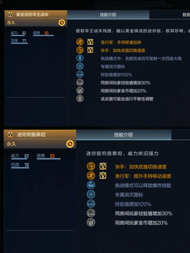 在竞技模式中,迷你辛王战车轻击爆头是180、打身体是90,黄金版轻击爆头是190,打身体是95,黄金版在伤害和范围上略占优势。而在挑战模式中,黄金版的四连火炮技能能快速清理群怪,实战效率远超普通版。