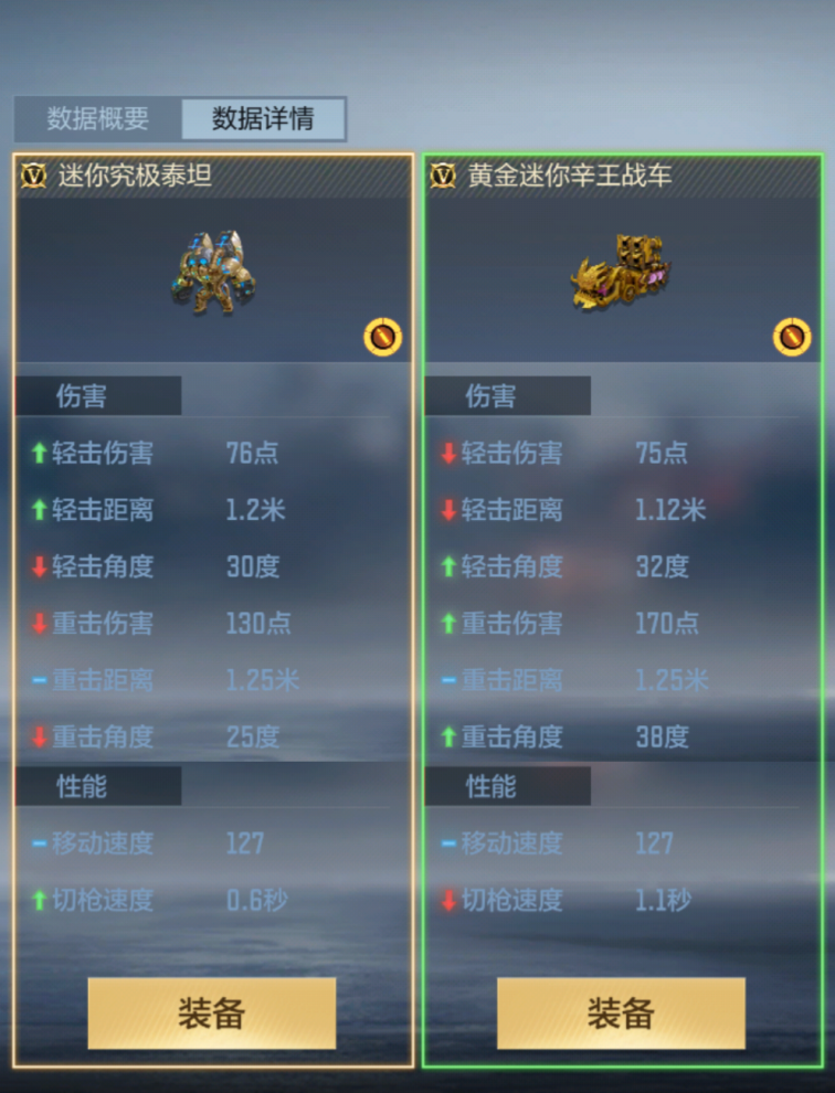 迷你究极泰坦与黄金迷你辛王战车对比,除了轻击伤害、距离与切枪时间外,黄金迷你辛王战车的数据都是遥遥领先,特别是重击角度来到了38度。