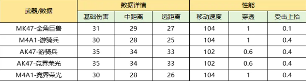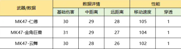 我们将MK47-金角巨兽与MK47-仁德、MK47-云舞基础数据进行对比我们发现,MK47-金角巨兽在这三把武器中处于中等排名。基础伤害31,领先同系列其他武器,远距离和移动速度略低于MK47-仁德,但仍保持在第一梯队水准。所以在MK47系列步枪当中,金角巨兽也是非常好的选择。