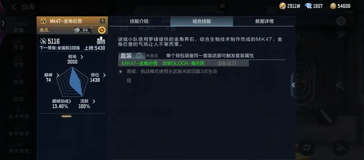 搭配改装GLOCK-魔杀族以及血影战刀凑成套装,在挑战模式中使用主武器杀敌可回复3点生命值,提升续航能力。