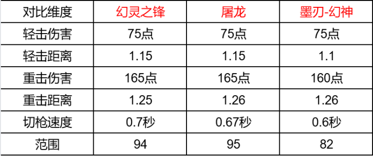幻灵之锋与屠龙、墨刃-幻神对比,幻灵之锋在轻击距离、轻击角度、重击伤害上表现出色,尤其轻击角度远超墨刃-幻神;屠龙在重击距离、角度上略占优,墨刃-幻神切枪速度最快。
