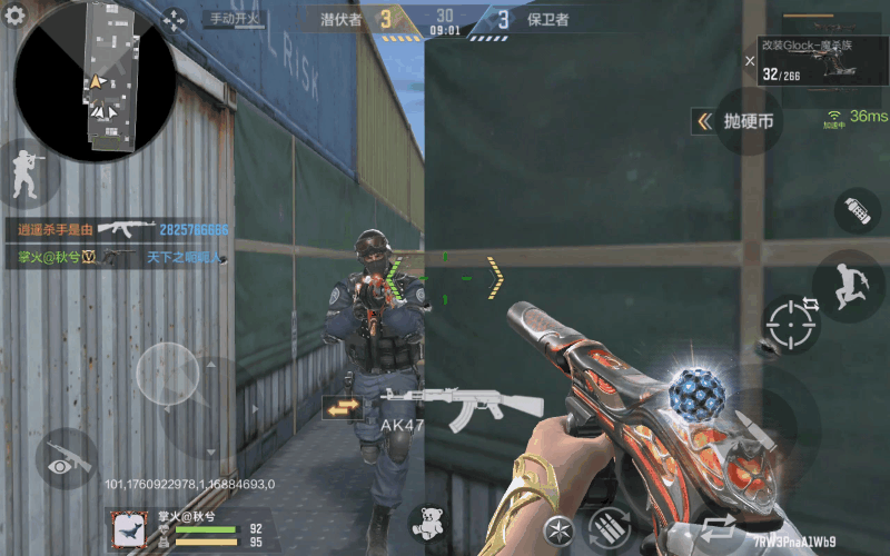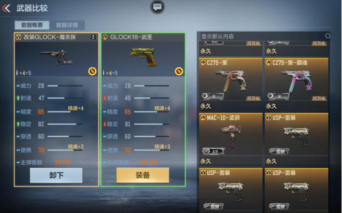 改装GLOCK-魔杀族的稳定值82(GLOCK18-武圣81)让连发射击时枪口上跳更轻微,移动精准47(GLOCK18-武圣46)、点射稳定性57(GLOCK18-武圣52)让跑射、点射的准星更易把控,垂直后坐力73(GLOCK18-武圣71)也降低了压枪难度。