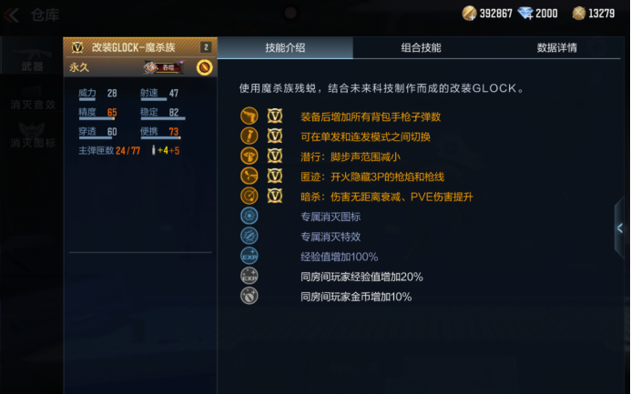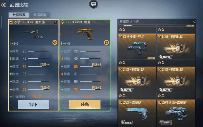 改装GLOCK-魔杀族对标GLOCK18-武圣时,优势堪称全方位碾压。它的射速达到428发/分(GLOCK18-武圣仅400发/分),连发模式下子弹倾泻更迅猛,近距离火力压制力直逼冲锋枪。伤害表现也极度稳定,GLOCK18-武圣的伤害会随距离大幅衰减(中距离19点、远距离13点),但魔杀族全距离伤害均保持28点,无论是近距离贴脸还是中远距离补枪,都能保证稳定输出。