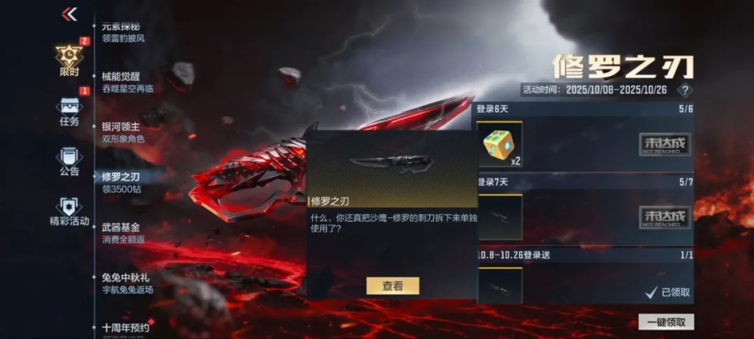 修罗之刃活动最后几天,还没有完成该活动的CFer可得抓紧时间了。动动小手即可获得3500钻石+2枚典藏之骰,仅需登录即可领取哦~活动期间累计登录7天可领取炫酷的近战武器修罗之刃,抓紧时间参与活动~