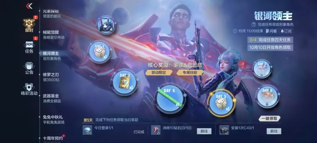 银河领主活动返场吞噬星空联动角色罗峰&巴巴塔,只需完成任意4天任务即可获得该角色。不过还是建议各位CFer一项项任务都清完,毕竟可以领取不少王者之骰、钻石等资源道具,还有各类宝箱哦~