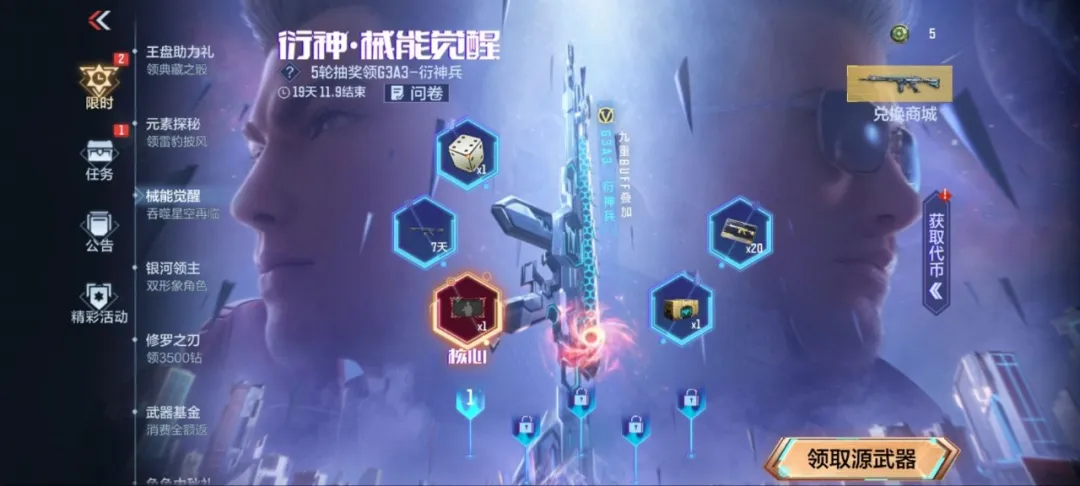 吞噬星空联动活动限时返场。完成任务获取衍神币参与打造,打造5轮后即可获得G3A3-衍神兵。很多CFer早已获取了这款武器,但别忘了打造过程中依旧可以获得不少王者之骰、钻石宝箱等资源道具。