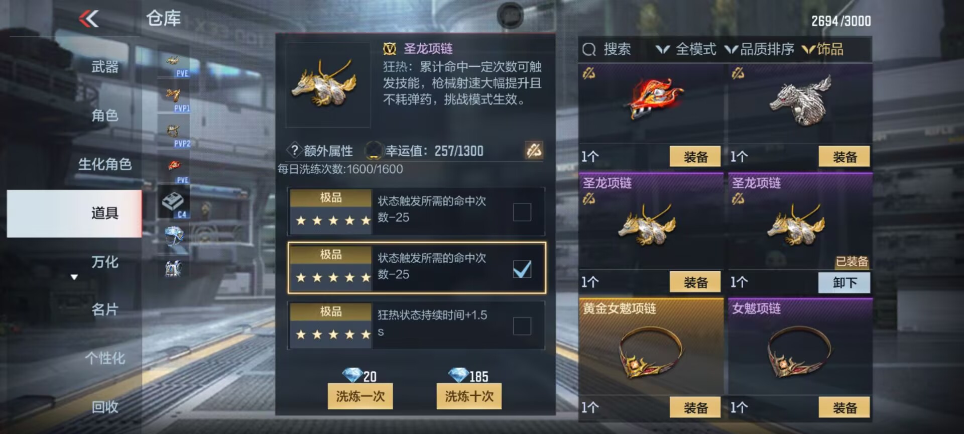 实际战斗的时候建议携带圣龙项链,如果将这款武器作为常用挑战武器的话,可以专门洗练几条“狂热状态触发所需命中次数减少xx次”的词条,可能会损失一些极限状态下的输出,但是整体的游玩体验会好不少。