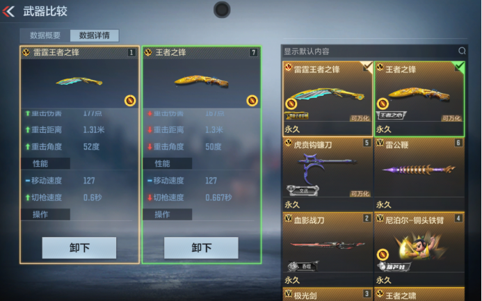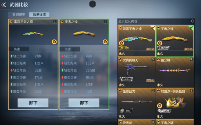 在武器对比中,我们将雷霆王者之锋与同为王者尼泊尔系列的的王者之锋进行比对,雷霆王者之锋在多方面表现优于王者之锋。其轻击与重击伤害分别达到 77 点和 177 点,输出更具威胁。攻击范围更广阔,轻击与重击距离分别为 1.21 米和 1.31 米,近战中更易命中目标。