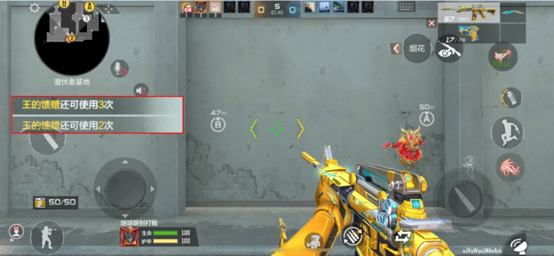 我们调整了王者武器馈赠的提示,将其独立显示在屏幕下方,同时优化了显示效果。