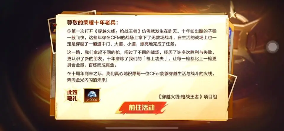 十年不是终点,是新的起点。从2015到2025,CF的世界因每一位玩家的参与而鲜活。无论是“荣耀老兵”的坚守,还是“淬金王者”的热忱,都是这款游戏最珍贵的财富。下一个十年,愿我们依然能在CF的战场相遇,以枪为证,以兄弟之名,续写新的传奇。